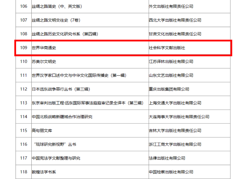 近日,國家出版基金規(guī)劃辦官網(wǎng)對2024年度國家出版基金資助項目予以公示。我校張秋生教授擔(dān)任首席專家的國家社科基金重大項目《世界華商通史》(五卷本)名列其中,計劃于社科文獻(xiàn)出版社出版。該著于2023年已獲批國家“十四五”社科重點出版項目。(一審:張秋生,二審:鄭曉坡,三審:殷子鈺)