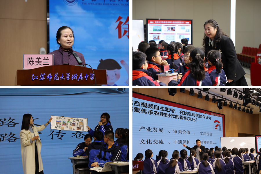 課例展示環節,江蘇師范大學附屬中學的老師們以“弘揚傳承中華優秀傳統文化”為主題同上一堂課。小學部教師周楠以“徐州名片我打造”為題,教育學生領略城市之美、傳播城市之魅。初中部教師時雨菲以“延續文化血脈”為題,將絲綢之路作為整節課的線索,通過情景劇、頭腦風暴等教學活動,促使學生領悟優秀傳統文化之美。高中部教師高愛松以“弘揚優秀傳統文化,建設文化強國”為題,設計“探尋香包的文化價值”總議題,探香包傳承之意,尋香包傳承之策,以學生熟悉的香包文化為線索,展示香包文化的地域特色,并以此闡述傳統文化的特點、當代價值、面臨困境以及如何走向世界。