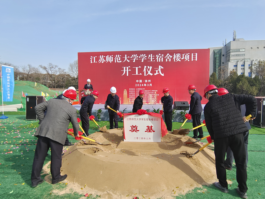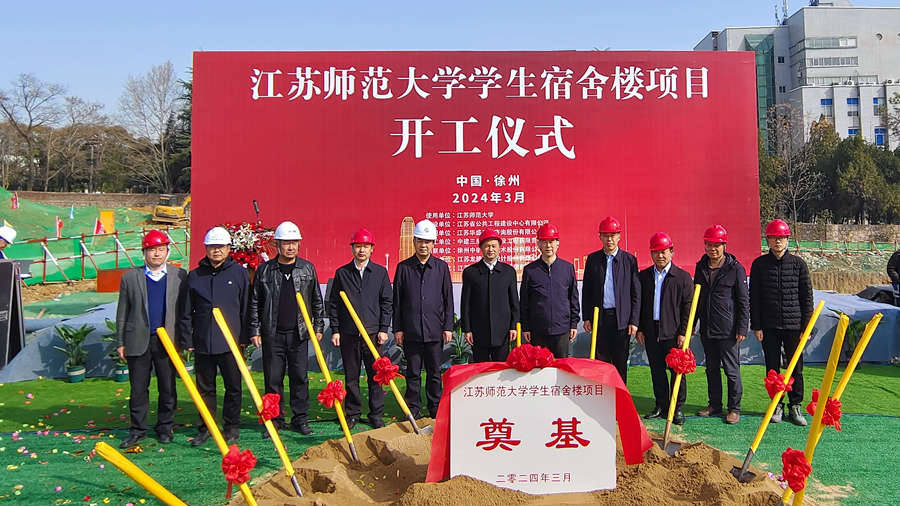 3月21日上午,我校學生宿舍樓項目開工儀式在泉山校區順利舉行。校黨委常委、副校長張其飛,江蘇省住房與城鄉建設廳政府投資工程集中建設管理處副處長馮剛,江蘇省公共工程建設中心有限公司黨總支書記、執行董事陳海陸,中建三局華東分局副局長、江蘇投資建設有限公司董事長夏大焰等出席儀式并共同為項目培土奠基。項目勘察單位、設計單位、監理單位、跟蹤審計單位及我?;ㄌ帯⒑笄诠芾硖帯⒑笄诩瘓F等相關負責人參加了開工儀式。