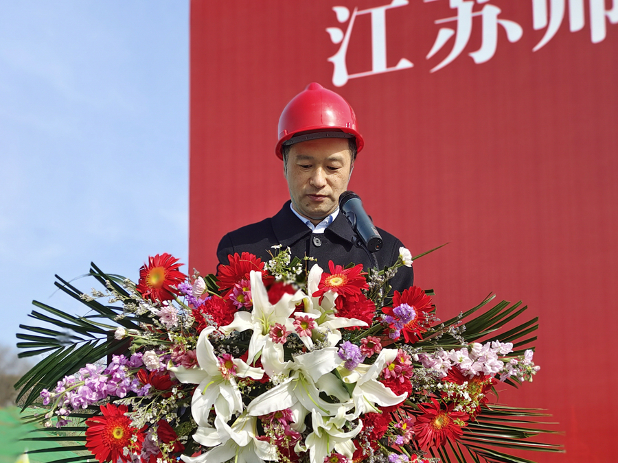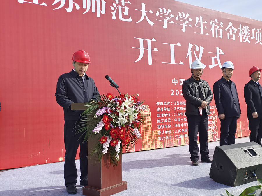 陳海陸在致辭中指出,江蘇師范大學學生宿舍樓項目是省公建中心在徐州市銅山區開工的第一個集中建設項目,也是銅山區2024年度城建重點工程,更是省屬高校學生宿舍建設重點項目。省公建中心對此高度重視,將秉持規范科學、專業高效、盡職廉潔的理念,堅持掛圖作戰、精細化管理,全面加大組織協調力度,攻堅克難,督促各參建單位優化施工方案、科學組織實施,提高項目管理的專業化水平,切實管控好項目建設質量、安全、進度和成本。