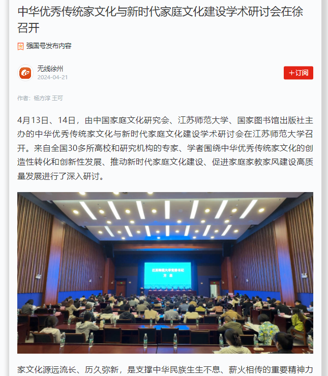 學(xué)習(xí)強(qiáng)國徐州平臺(tái)4月21日?qǐng)?bào)道在我校舉辦的中華優(yōu)秀傳統(tǒng)文化與新時(shí)代家庭文化建設(shè)研討會(huì),報(bào)道內(nèi)容如下: