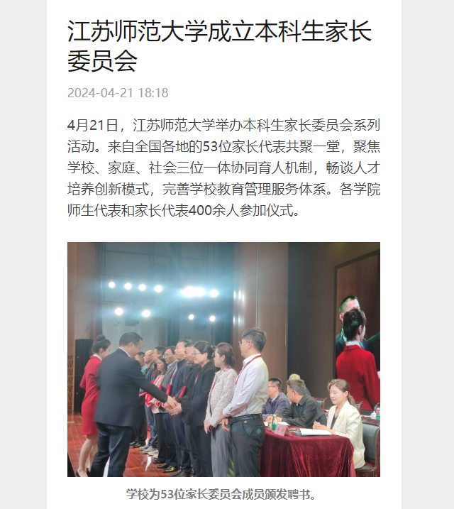 徐州日報漢風號4月21日報道我校成立家長委員會,報道內容如下: