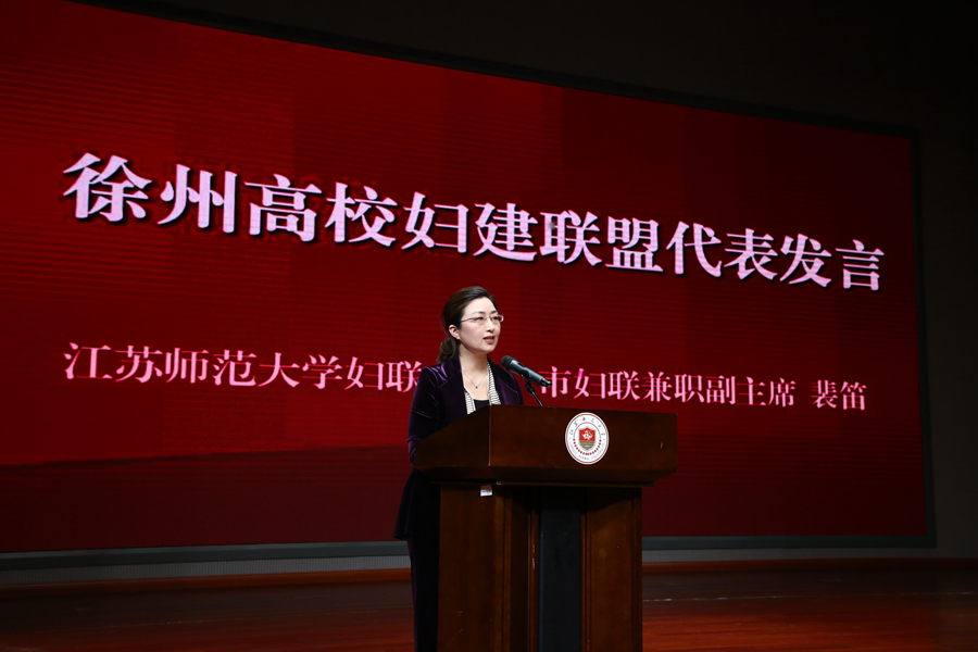 蔡國春在大會上致辭,向出席活動的嘉賓和師生表示熱烈歡迎,向長期關(guān)心支持我校事業(yè)發(fā)展的市委市政府、市婦聯(lián)以及兄弟高校的領(lǐng)導(dǎo)、同仁表示感謝。他指出,江蘇師范大學(xué)黨委堅持把婦女工作作為黨的工作重要組成部分,重視發(fā)揮女性師生的智慧和力量,積極為女性師生成長成才創(chuàng)造條件、搭建平臺。學(xué)校婦聯(lián)充分發(fā)揮“引領(lǐng)、服務(wù)、聯(lián)系”職能,帶領(lǐng)全校女性師生在學(xué)校高水平大學(xué)建設(shè)的各條戰(zhàn)線上貢獻才智、建功立業(yè),學(xué)校婦女事業(yè)呈現(xiàn)出蓬勃發(fā)展的良好態(tài)勢。高校婦建聯(lián)盟成立是新時代加強婦女工作的新形式新舉措,通過陣地共建、活動共辦、服務(wù)共促等方式,實現(xiàn)徐州高校婦建資源共享,為女性師生搭建新的交流活動平臺,實現(xiàn)以聯(lián)盟賦能巾幗“她力量”,將進一步促進高校婦女事業(yè)和婦聯(lián)工作高質(zhì)量發(fā)展。我校婦聯(lián)將以此次活動為新起點,進一步加強與在徐高校婦女組織之間的協(xié)同協(xié)作,凝聚高校女性師生力量,為打造徐州高校婦女事業(yè)和婦聯(lián)工作的“金字”招牌貢獻力量。