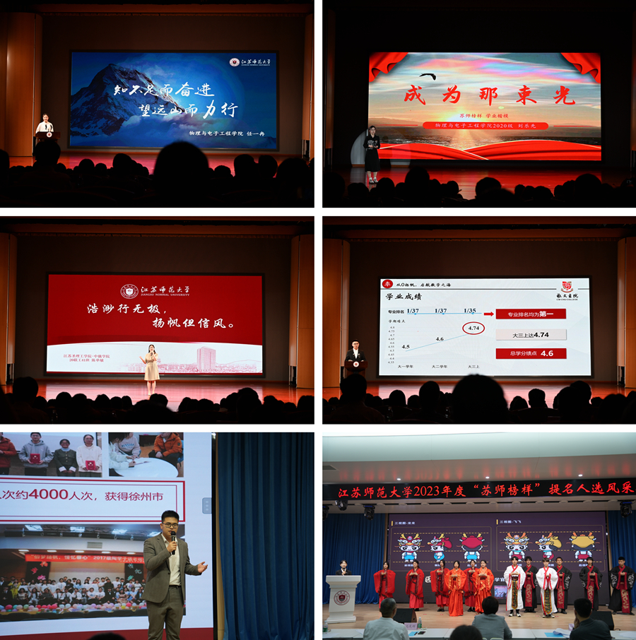 4月26日,江蘇師范大學2023年度“蘇師榜樣”評選活動在馬可音樂廳及路演大廳同時舉辦。校黨委常委、宣傳部部長孟召學,學校有關部門負責同志出席展評活動,各學院副書記、輔導員等師生代表500余人現場觀摩展評。