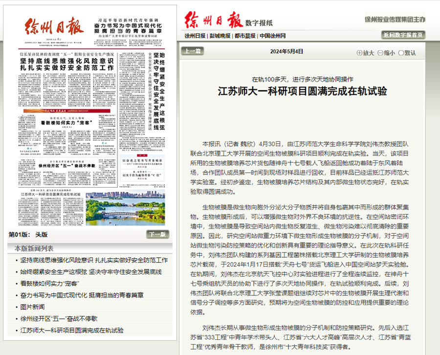 徐州日報5月4日報道我校科研項目在軌實驗情況,報道內容如下: