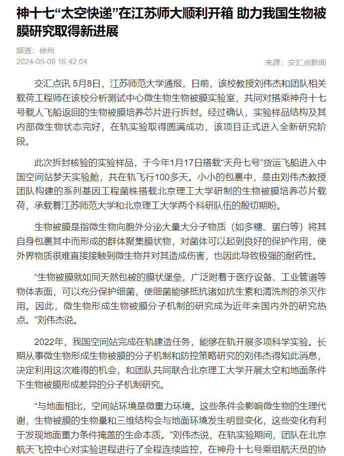 神十七“太空快遞”在江蘇師大順利開箱 助力我國(guó)生物被膜研究取得新進(jìn)展