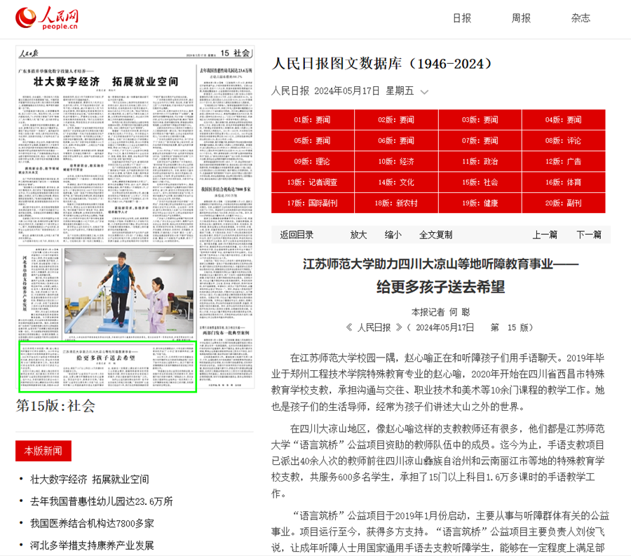 人民日報5月17日報道我校到四川大涼山開展手語支教事跡,報道內容如下: