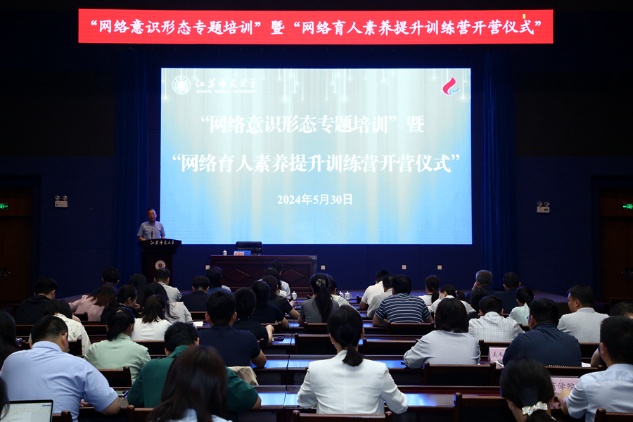 為深入學(xué)習(xí)貫徹習(xí)近平新時(shí)代中國特色社會(huì)主義思想和黨的二十大精神,深入實(shí)施“時(shí)代新人鑄魂工程”,提升學(xué)校思想政治工作隊(duì)伍網(wǎng)絡(luò)育人素養(yǎng),進(jìn)一步增強(qiáng)意識(shí)形態(tài)工作能力,我校舉辦網(wǎng)絡(luò)意識(shí)形態(tài)專題培訓(xùn)暨網(wǎng)絡(luò)育人素養(yǎng)提升訓(xùn)練營。5月30日上午,訓(xùn)練營開營儀式暨專題培訓(xùn)首場(chǎng)報(bào)告會(huì)在分析測(cè)試中心100舉行。校黨委副書記蔡國春出席儀式并講話。江蘇省網(wǎng)絡(luò)文明研究中心執(zhí)行主任,南京師范大學(xué)新聞與傳播學(xué)院二級(jí)教授、博士生導(dǎo)師張曉鋒應(yīng)邀作首場(chǎng)專家報(bào)告。各學(xué)院黨委書記、副書記、黨務(wù)秘書、網(wǎng)絡(luò)思政工作人員代表參加活動(dòng)。校黨委常委、宣傳部部長(zhǎng)孟召學(xué)主持活動(dòng)。