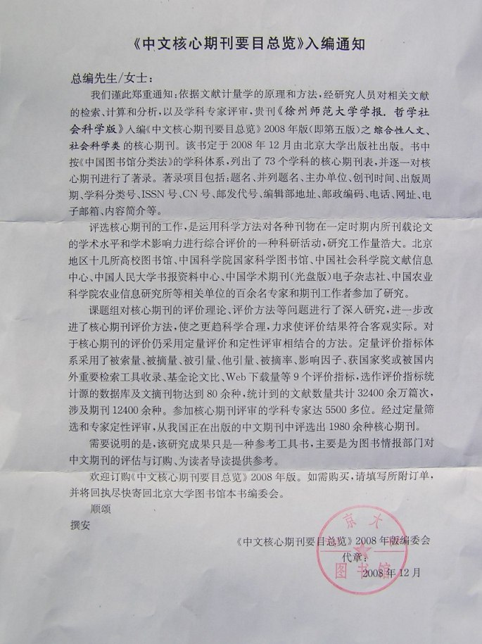 根據(jù)《中文核心期刊要目總覽》2008年版編委會(huì)通知,《徐州師范大學(xué)學(xué)報(bào)》(哲學(xué)社會(huì)科學(xué)版)已入編《中文核心期刊要目總覽》2008年版(即第五版)之綜合性人文、社會(huì)科學(xué)類核心期刊。特向全校領(lǐng)導(dǎo)和師生報(bào)喜!
