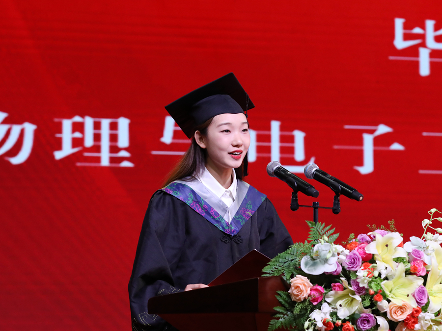 省三好學生、省優秀共青團員、省優秀畢業生、2023年度“蘇師榜樣”獲得者 物理與電子工程學院任一冉同學作為畢業學生代表發言。她帶領同學們一起深情回顧了大學生活的點滴,表達了對同窗、對師長、對母校的感恩與眷戀,同時也勉勵同學們云程發軔、揚鞭策馬,以昂揚的師大精神,熱情奔赴下一場山海。