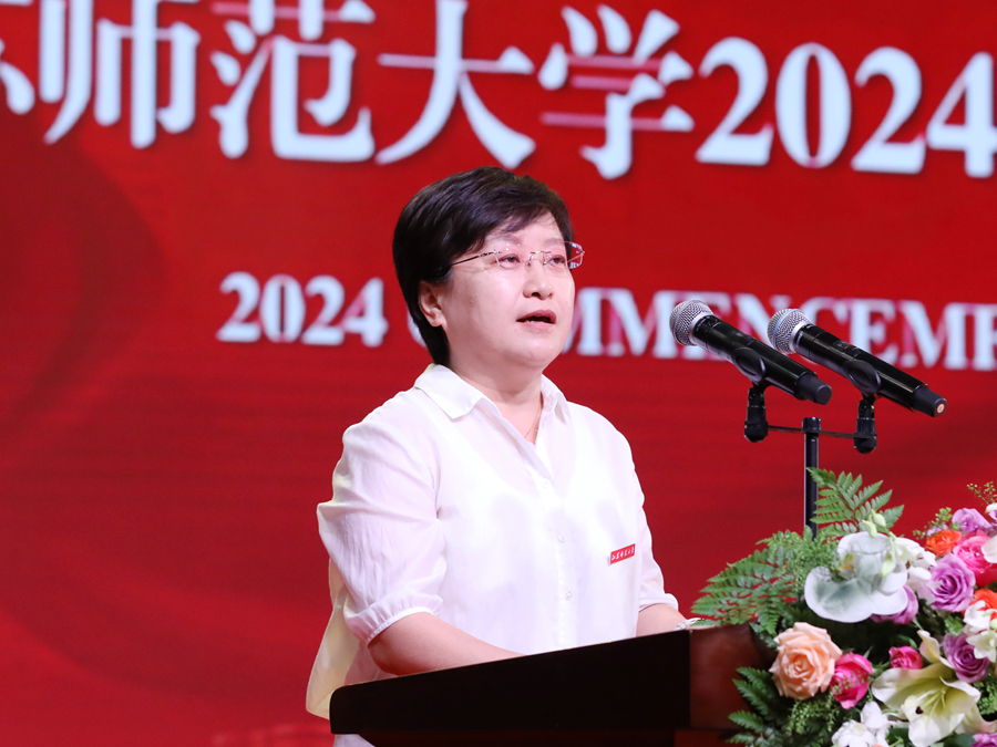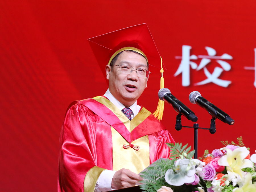 校學位評定委員會主席、校長周汝光在典禮上致辭,代表全校師生員工,向圓滿完成學業的4882名本科畢業生同學表示最熱烈祝賀,向一路關心培養廣大同學成長成才的家長和老師致以崇高敬意和衷心感謝。他指出,四年的時光,一生的回憶。四年大學時光,同學們見證了彼此的成長和母校的發展,母校和師長們也見證了每個同學的成長與蛻變。習近平總書記寄語年輕一代,要爭做有理想、敢擔當、能吃苦、肯奮斗的新時代好青年,奮力書寫為中國式現代化挺膺擔當的青春篇章。同學們即將背上行囊、揚帆起航,作為新時代青年,要堅持終身學習,提升自我,篤行不怠;要擁抱無限可能,錘煉韌性、敢想敢干;要胸懷國之大者,激揚青春、砥礪奮斗。最后,周汝光深情叮囑全體2024屆本科生,無論今后身在何處,師大永遠是廣大同學的堅強后盾和精神家園,希望同學們前程似錦,一往無前。
