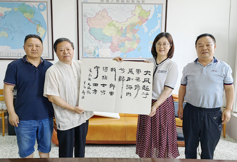 捐贈儀式前,郭謙先生一行和圖書館負責同志以及館員代表舉行了簡短座談會,會上,圖書館負責同志詳細介紹了圖書館的發展歷程與現狀,并邀請郭謙先生現場創作書法作品。郭謙先生欣然應允,揮毫潑墨,書寫《大風歌》書法作品贈送圖書館。