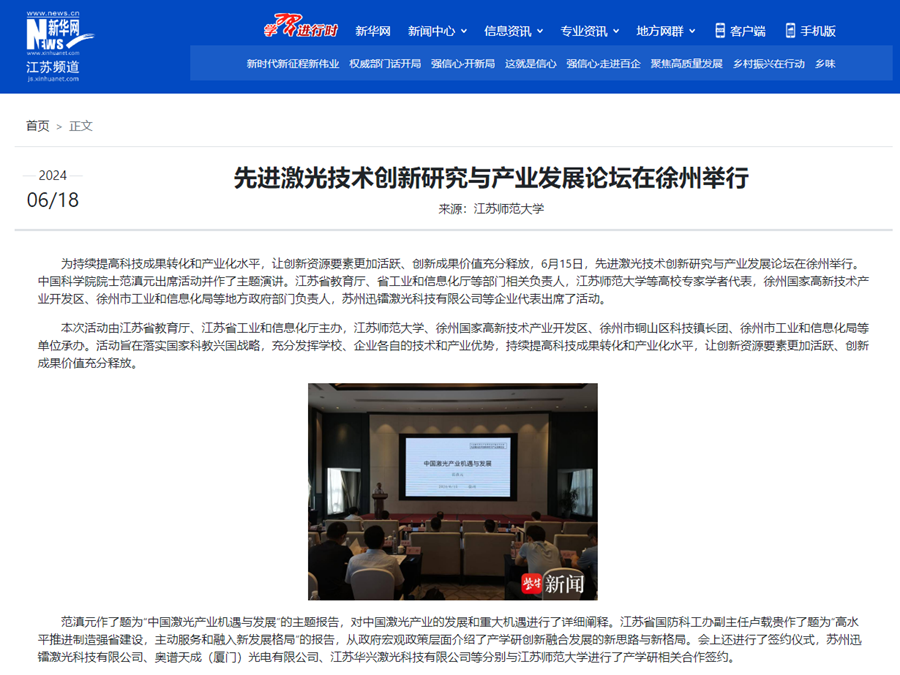 新華網江蘇頻道6月18日報道在我校舉辦的先進激光技術創新研究與產業發展論壇,報道內容如下: