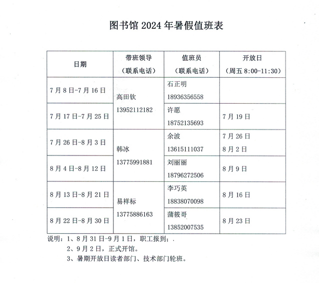 附:圖書館2024年暑假值班表