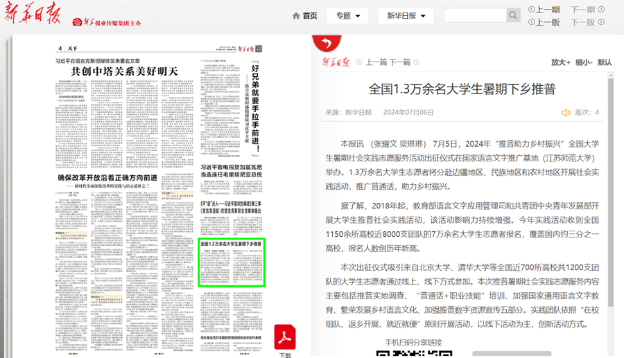 新華日報7月6日報道在我校舉辦的2024年“推普助力鄉村振興”全國大學生暑期社會實踐志愿服務活動出征儀式,報道內容如下: