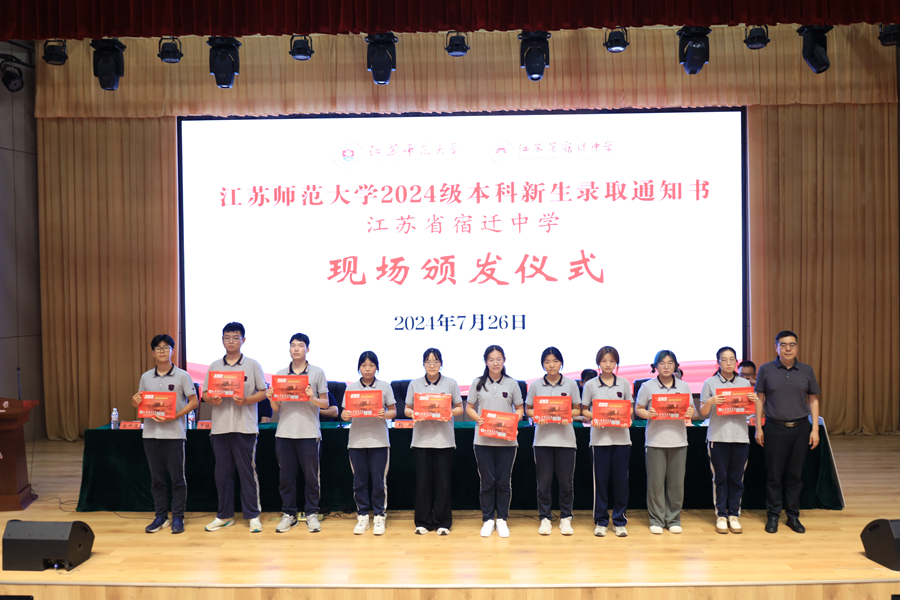 7月26日下午,江蘇師范大學在宿遷中學舉行本科新生錄取通知書頒發儀式。儀式上,副校長趙鵬首先代表江蘇師范大學向錄取到我校的58名2024級本科新生表示熱烈祝賀,然后逐一為新生頒發錄取通知書,并殷切期望各位新生同學在未來幾年的大學學習生活中能夠秉持初心、求真務實,通過積極進取、主動探索,不斷完善自我、成就自我,勇敢肩負起時代使命,努力成長為國家棟梁。最后,對宿遷中學一直以來給予我校發展的大力支持和傾力幫助表示衷心感謝,并真誠期待兩校進一步加強交流與合作,積極構建緊密銜接的一體化人才培養模式,爭取為更多的優秀學子提供實現人生夢想的機會和平臺。