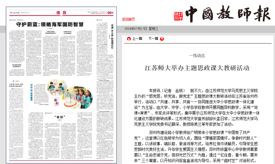 本報訊(記者 金銳) 前不久,由江蘇師范大學馬克思主義學院主辦的“感黨恩,聽黨話,跟黨走”主題思政課大教研活動在江蘇省徐州市舉行,活動以“共建、共享、共育——協同推進大中小學思政課一體化建設”為主旨,由大學、中學、小學各學段教師開展同題異構教學,采用“說課+演課”、專家點評等形式,集中展示江蘇師范大學在大中小學思政課一體化建設方面的教研成果。江蘇師范大學宣傳部部長孟召學,江蘇師范大學馬克思主義學院黨委書記薛深、教授陳美蘭等專家參加了活動。