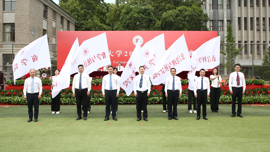 旗幟是精神的象征,是前進的指引,是血脈的傳承。在典禮上,各學院黨政負責人將象征著學院精神傳承的院旗鄭重交到新生代表的手中。迎風招展的一面面旗幟,昭示著青春與力量。