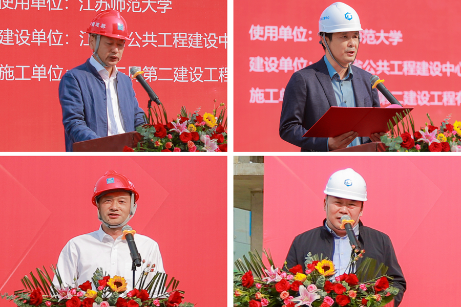 杜青周、沈志剛及各參建單位領導分別致辭,共同慶祝項目主體結構封頂這一重要里程碑事件,對項目建設進行階段性總結并提出工作要求。張其飛在致辭中對項目建設工作給予充分肯定,并強調工程質量,百年大計,封頂只是項目建設的關鍵一步,后續工作依然艱巨。希望在省公建中心統一指揮下,各參建單位加強協同配合,嚴格施工程序,強化質量控制和安全管理,保質保量早日竣工,投入使用,惠澤萬千學子。方忠宣布江蘇師范大學學生宿舍樓正式封頂。