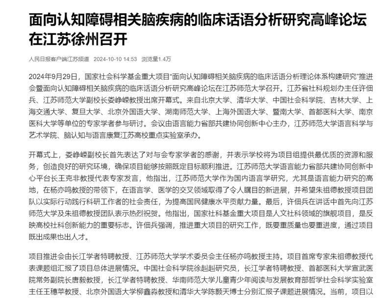 人民日報客戶端10月10日報道我校舉辦的面向認(rèn)知障礙相關(guān)腦疾病的臨床話語分析研究高峰論壇,報道內(nèi)容如下: