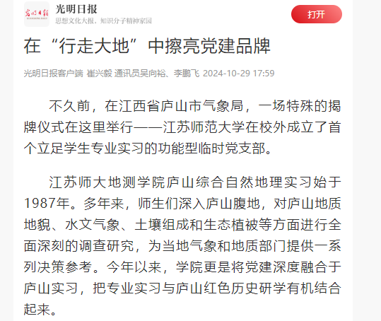 不久前,在江西省廬山市氣象局,一場特殊的揭牌儀式在這里舉行——江蘇師范大學在校外成立了首個立足學生專業實習的功能型臨時黨支部。