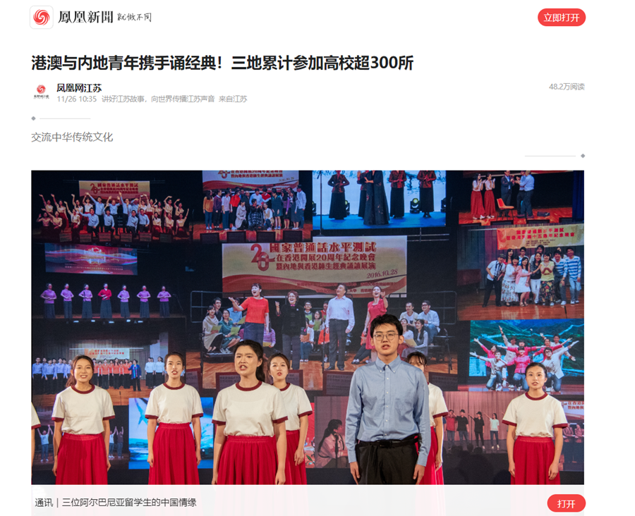 鳳凰新聞網11月26日報道我校語言科學與藝術學院到香港開展經典誦讀交流有關信息,報道內容如下: