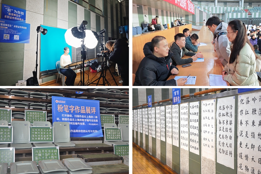 在招聘會現(xiàn)場還設(shè)立了“職愿”服務(wù)臺,為畢業(yè)生提供證件照拍攝、簡歷問診、模擬面試、求職正裝租用等一站式服務(wù)。就業(yè)指導(dǎo)老師在現(xiàn)場為畢業(yè)生們開展了“一對一”咨詢指導(dǎo),幫助求職畢業(yè)生修改完善簡歷、提升面試技能?,F(xiàn)場還舉辦了師范生教育特色展,展出了在校師范生的粉筆字、毛筆字作品,同時也展出了我?!笆褞煼渡?、從教師范類畢業(yè)生的事跡與風(fēng)采?;窗彩薪逃?、浙江省浦江縣教育局隨后與組團招聘學(xué)校工作人員共同開展了面試考察和說課考核;淮安天山外國語學(xué)校、高郵市朝陽學(xué)校、常州市宋劍湖高級中學(xué)等十余所學(xué)校開展應(yīng)試求職畢業(yè)生的考核工作。
