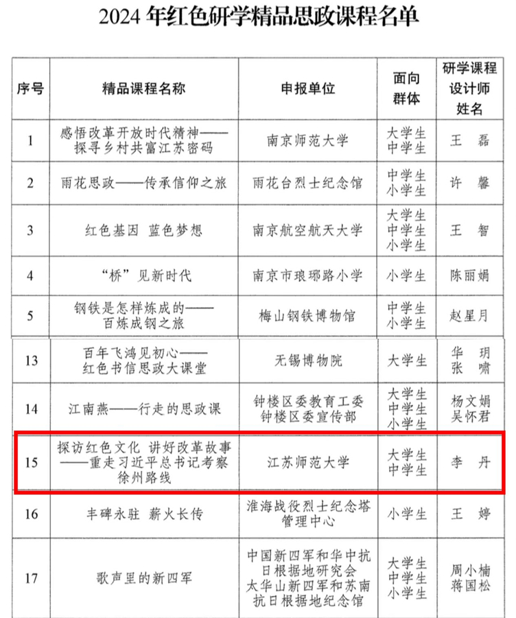 近日,江蘇省文化和旅游廳、江蘇省教育廳和新華日報社共同發布《關于公布2024年紅色研學精品思政課程名單的通知》(蘇文旅發〔2024〕89號)。由我校馬克思主義學院李丹副教授設計申報的課程《探訪紅色文化講好改革故事——重走習近平總書記考察徐州路線》,被評為2024年江蘇省紅色研學精品思政課程。