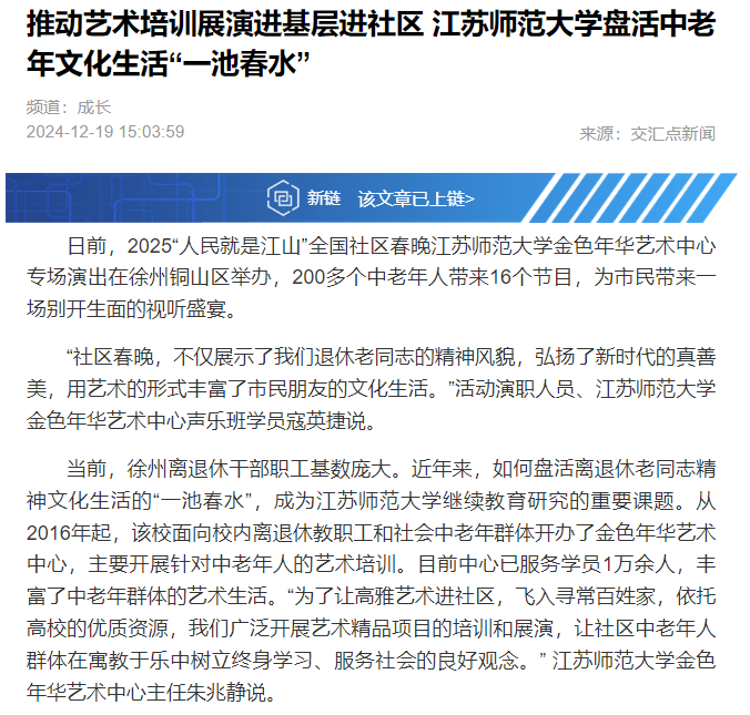 推動藝術培訓展演進基層進社區 江蘇師范大學盤活中老年文化生活“一池春水”