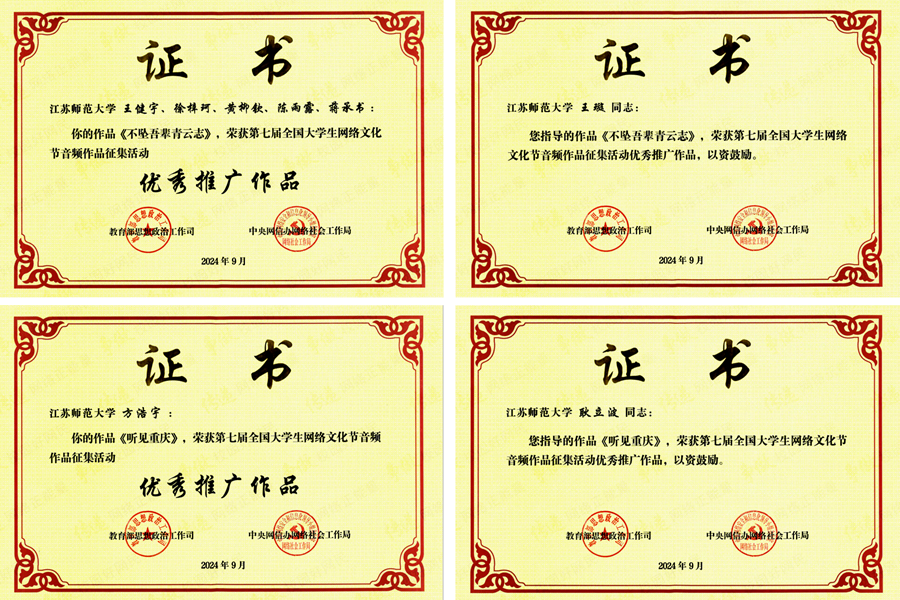 本屆“一節一推選”以“爭做校園好網民,匯聚網絡正能量,挺膺擔當建新功”為主題,旨在引導廣大師生樹立正確的網絡觀,弘揚社會主義核心價值觀,傳播網絡正能量,促進校園文化建設和學生全面發展。我校4項作品在全國50771件參賽作品中脫穎而出。由語言科學與藝術學院耿立波老師指導的音頻作品《聽見重慶》榮獲“優秀推廣作品”獎、科文學院王璇老師指導的音頻作品《不墜吾輩青云志》榮獲“優秀推廣作品”獎,科文學院屠強老師指導的其他類網絡創新作品《非遺|時空穿梭之旅,啟程!》榮獲“優秀推薦作品”獎。此外,在第七屆全國高校網絡教育優秀作品推選展示活動中,商學院鮑春曉老師的微課《81192,國已強,請返航》榮獲“優秀入圍作品”獎。