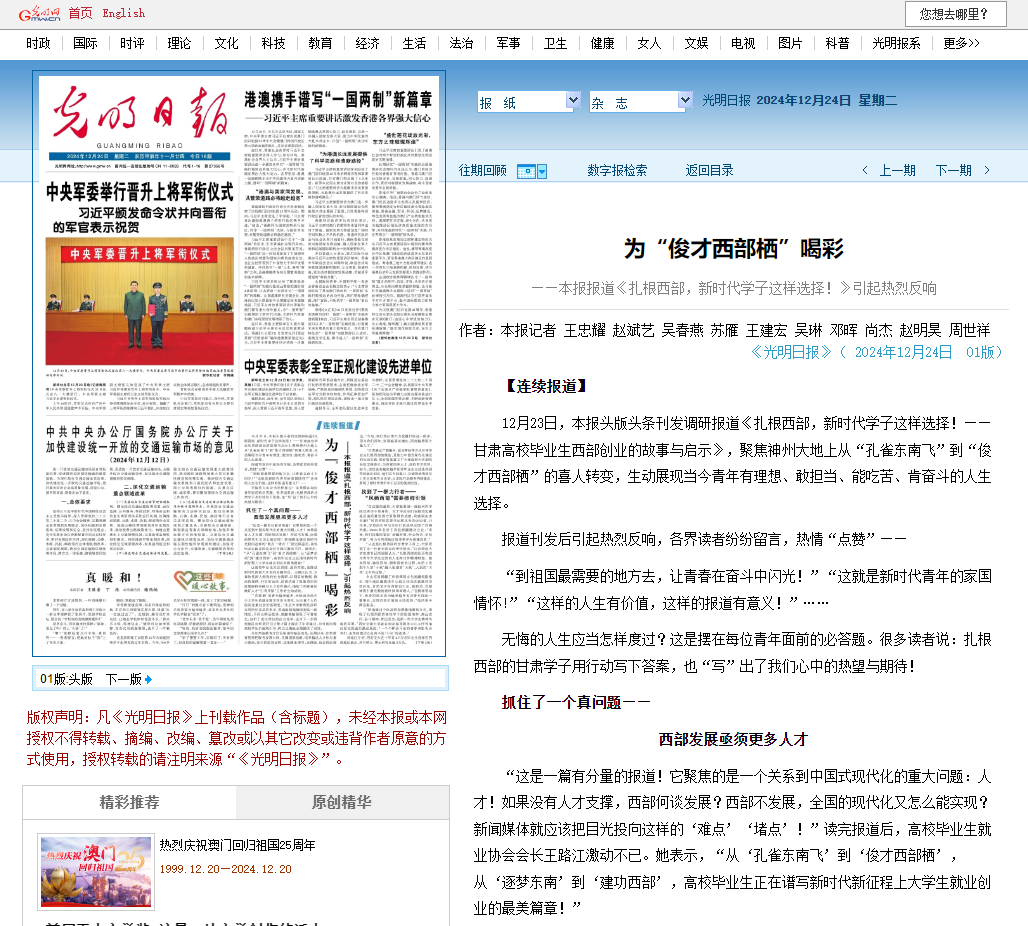 光明日版12月24日頭版以《為“俊才西部棲”喝彩——本報報道<扎根西部,新時代學子這樣選擇!>引起熱烈反響》為題,綜合報道甘肅高校畢業(yè)生西部創(chuàng)業(yè)的故事與啟示,以及報道后引起的社會反響,其中文章第二部分“找到了一群力行者——‘鳳棲西部’需要榜樣引領(lǐng)”,報道了對我校黨委書記芮國強同志的采訪內(nèi)容。報道內(nèi)容如下:
