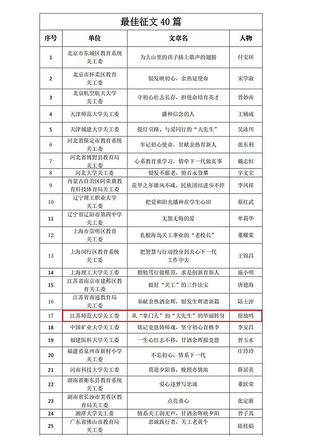 近日,教育部關(guān)工委公布了“楓葉正紅一一記教育系統(tǒng)關(guān)心下一代優(yōu)秀人物”征文活動(dòng)的評(píng)審結(jié)果,經(jīng)省教育系統(tǒng)關(guān)工委遴選推薦,我校報(bào)送參評(píng)作品《從“掌門(mén)人”到“大先生”的華麗轉(zhuǎn)身——記江蘇師范大學(xué)關(guān)工委常務(wù)主任徐放鳴》榮獲“最佳征文”獎(jiǎng)。