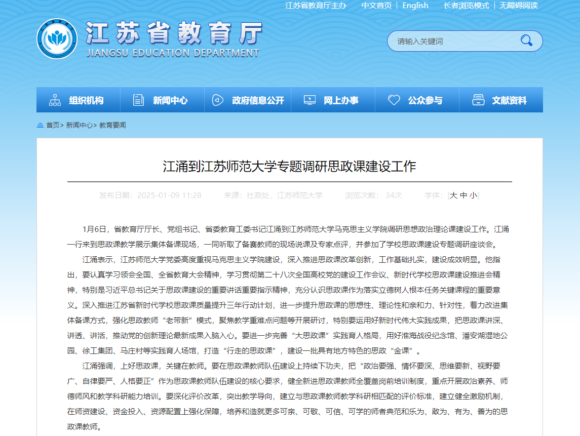 1月9日江蘇省教育廳官網報道江涌廳長到我校調研思政工作,報道內容如下: